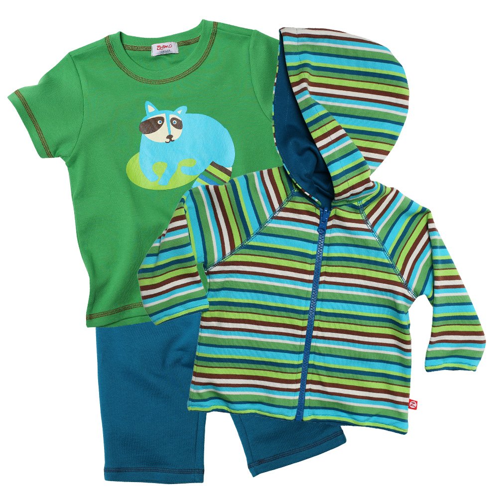 This zutano ensemble is great for both cool and warm weather because of the added layer, a reversible hoodie, the hoodie features a print one side and solid on the other so it can be worn with many other shirts, paired with the hoodie is a short sleeve screen tee and terry pant, the perfect outfit for fall